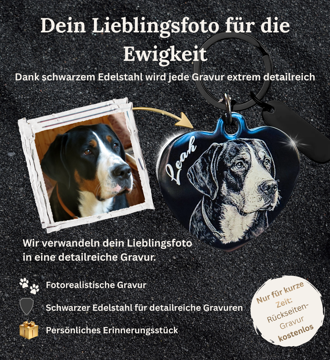 Der dunkle Edelstahl sorgt dafür, dass jedes Detail deines Fotos besonders klar und kontrastreich graviert wird. So entsteht ein persönliches Erinnerungsstück, das dich jeden Tag begleitet.