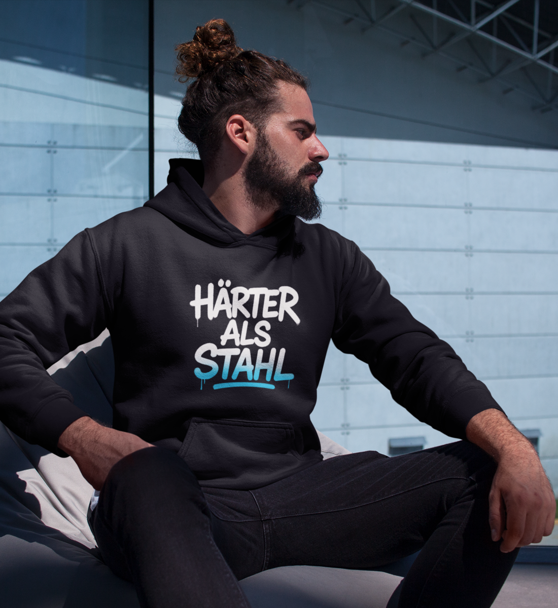 Dieser Hoodie ist mehr als nur ein Kleidungsstück – er ist ein Statement. Mit dem markanten Print „HÄRTER ALS STAHL“ in freshem Graffiti-Style zeigst du, dass du keine halben Sachen machst. Die Kombination aus kräftigem Weiß und leuchtendem Blau sorgt für maximalen Kontrast auf dem schwarzen Stoff und zieht garantiert alle Blicke auf sich.